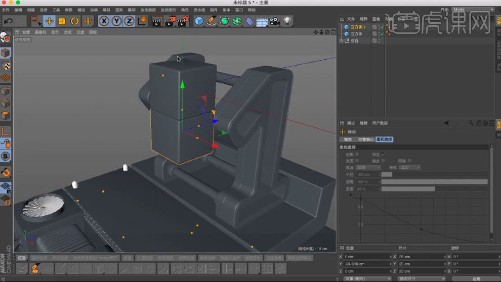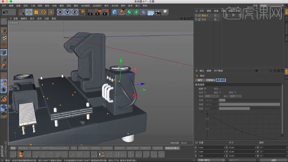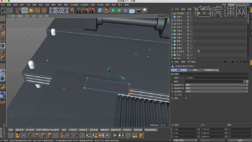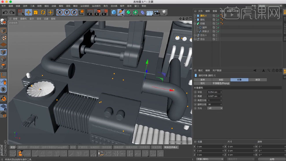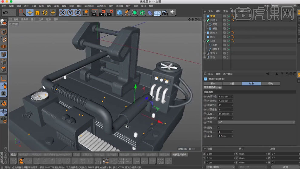 用【画笔】绘制样条。调整【.X】。【缩放东西】缩小。选择【边】,打消勾选【闭合样条】,11.复制几个管道,调整大小。再复制一个。做为立方体的子级。新建2个【立方体】,调整半径。新建【管道】,选择【点】,